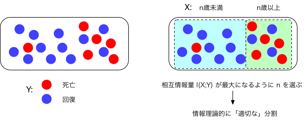 ここで、$X$の定義を「$n$歳未満」と「$n$歳以上」という風に一般化した上で、 $n$の値を変えながら相互情報量 $I(X(n);Y)$ の違いを調べたとしよう。 そして、ある$n=n^*$のところで相互情報量が最大になったとすると、 「死亡」か「回復」かについての情報との関係性が最大となるような データの分割方法(「$n^*$歳未満」と「$n^*$歳以上」)が得られたことになる。