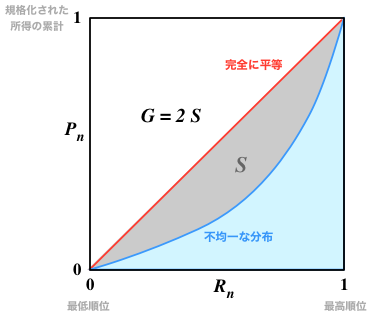 所得に格差が生じている場合は、高所得者側に全体の所得が多く分配されるので、図のように、$R_n$と$P_n$は、下に凸の形状に変わる。 実際に計算すると、その面積の比率は$N$が十分大きければ(台形近似で) $$ G = 1 - \frac{2}{N} \left[ \sum_{n=1}^{N-1} P_n + \frac{1}{2} \right] $$ となり、これはジニ係数(Gini coefficient)と呼ばれている。0が完全に平等な場合、1が少数(一人)に所得が集中している場合に相当する。