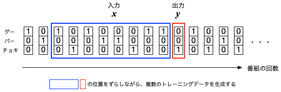 一方、出力$y$に対応するのは、その翌週に出された手とする(下図参照)。