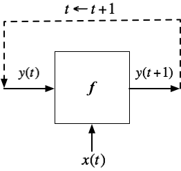 時系列的なベクトル情報(状態)$\boldsymbol{y}(t)$を考える。ここで、時刻$t$は離散的($t=0,1,2,\cdots$)とする。つまり$t$番目の情報が$\boldsymbol{y}(t)$ということである。 加えて、$t$番目に別のベクトル情報$\boldsymbol{x}(t)$が提示されるような状況を考える。 そのとき、$t+1$番目の状態が、$t$番目の状態によって決まる、すなわち、ベクトルからベクトルへの変換 $$ \boldsymbol{y}(t+1) = f(\boldsymbol{y}(t),\boldsymbol{x}(t)) \tag{1} $$ 関係が与えられているとしよう。 この関係を図示すると