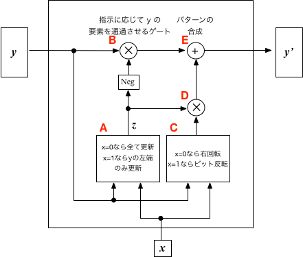 図で、Aのブロックは、$x$の状態によって、$\boldsymbol{y}$のどの「桁」を更新すべきかを出力する。$x=(1)$ならば $(1,0,0,0,0,0)$、 $x=(0)$ならば $(1,1,1,1,1,1)$ のように、更新されるべき箇所のみを1とおく。 これをゲート信号と呼ぶ。