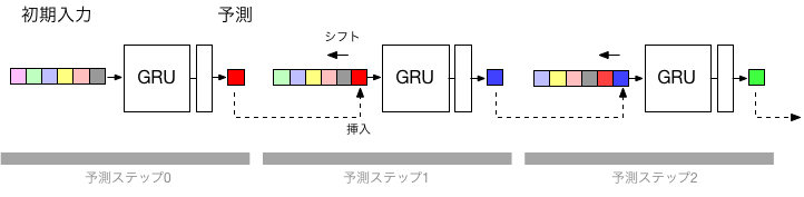学習が完了後、まず初期値を入力し、その結果を次のステップの予測のための入力とする操作を繰り返すことによって、多段階先までの予測が可能となる(下図)。