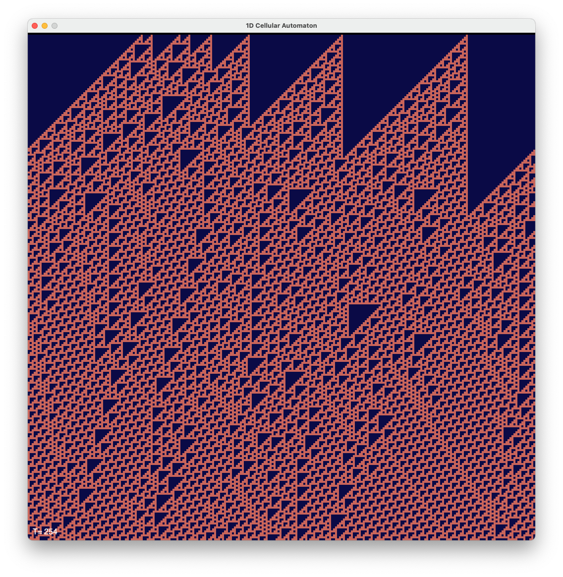 以下はこのコードを使ってルール番号110のシミュレーションを行った例(スクリーンショット)である。 時間ステップは、画面の上から下側に進行しており、状態1を赤茶色、状態0を暗い青色で表示している。