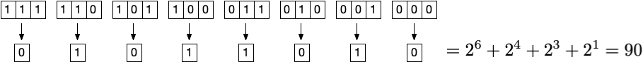 反対に、ルール番号 $R$ が与えられたとき、自分と両隣のパターンが $(b_2, b_1, b_0)$であったとすると、 $R$を二進数で表現した際の下の桁から$4 b_2 + 2 b_1 + b_0$ビット目が、次のステップの状態となることがわかる。