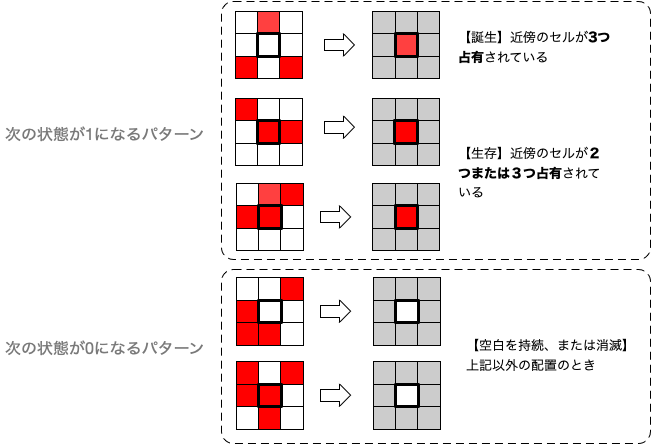 空間を碁盤の目のようなセルに分割して、上下左右と斜め方向を含む8つの近傍の状態に応じて、0か1かのどちらかの状態に遷移するルールを考える。 ここでは、生物の増殖過程を想定しながら、0はその場所が空の状態、1はそこに生物が生存している状況を表すものとし、