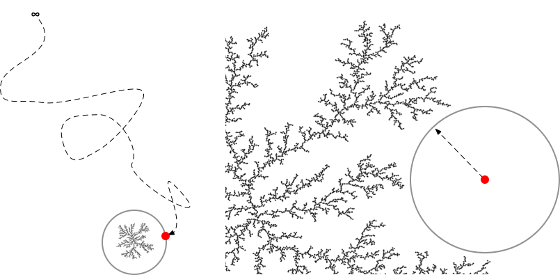 遠方から到達したランダム・ウォーカーは、クラスターより大きな円周上の点に等しい確率で1度目は到達する(左)。 クラスターと交わらない円の半径をステップ長として取ることができる(右)。