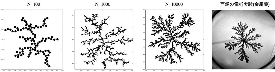 クラスターの数を100,1000,10000と増やしていった際のパターンの様子。 右端は電析実験によって得られた金属結晶(金属葉)の例。