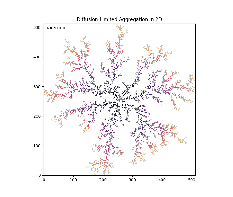 上のコードを走らせて、20000粒子を凝集させた例を以下に示す。