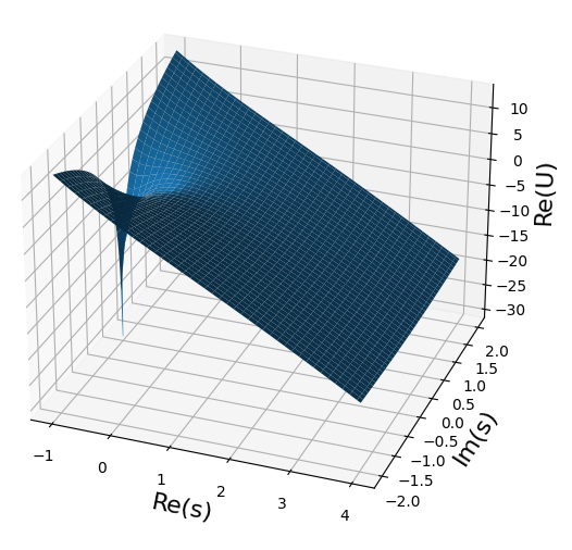 3.については、$s=0$で$u(s)$が発散するため、ax.set_zlim(-10,10)のようなコードを追加し、表示する「高さ」の範囲を制限するとよい。