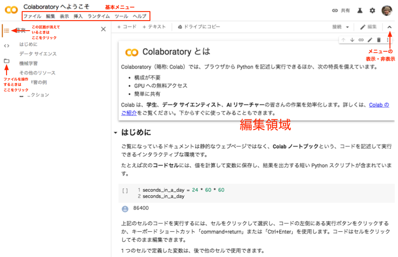 - 3分間の解説動画 Colabのご紹介(英語)を視聴してください。英語がわからなくても、画面だけ眺めておけば大丈夫です。