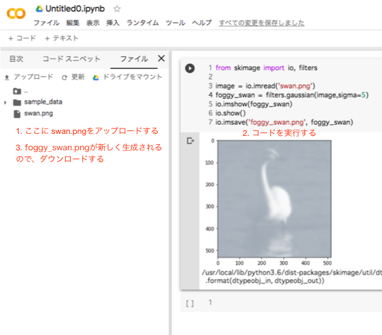 - 左の「ファイル」の区画にコードセルにfoggy_swan.pngというファイルで新たにできるので、それを右クリックして「ダウンロード」する
