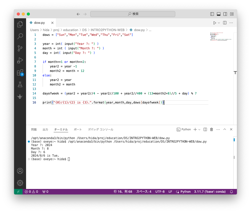 プログラムが正常に動作を始めると、西暦年、月、そして日をキーボードから入力するように求めてきます。 VSCodeの下側の区画(ターミナル)をマウスでクリックし、キーボードからそれぞれの項目を入力しEnterを押すと、 最後に、その日の曜日が出力されるはずです。 例えば、あなたの誕生日は何曜日だったでしょうか?