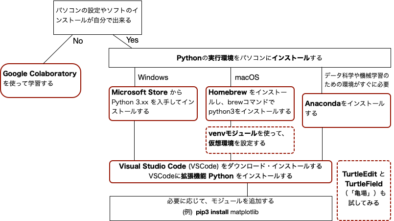 使用しているOS(オペレーティング・システム)は、ほとんどの場合は Windows と macOS、そして、その方面にかなり詳しい一部の方が Linux、といったところでしょうか。ともあれ、ご自分のパソコンとそのOSの使い方について、ある程度ご知識や経験のある方は、 ウェブ上の情報を手がかりに、Pythonのインストールにも挑戦してみましょう。