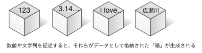 このように、この例題のコードを実行すると、整数、実数、文字列のデータがそれぞれ格納された「箱」がコンピュータの内部に生成されるが、 我々はそれを見ることができない。 そこで、次の例題では、データの内容を、スクリーン上にプリントする方法を学ぶ。