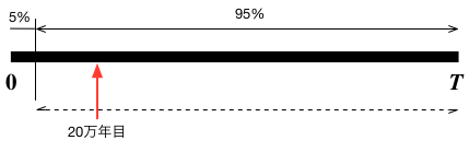 人類の存続期間$T$があらかじめ定められており、我々はその期間の中のどこかの時点で等しい確率で生を受けたとする。 $T$全体を、最初の5%の区間と、残りの95%の区間に分けると、我々は95%の確率で「後半」の区間に生存していることになる。 それが95%の区間の最初の時点、すなわち $t = T \times 0.05$(万年目)とすれば、人類はこれからさらに$t \times \frac{0.95}{0.05}$万年生存できることになる。 他方で、95%の区間の最後に位置する場合は、明日にでも人類は滅亡することになる。
