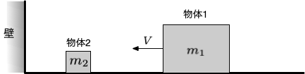このように「小さな」物体2は、物体1と壁の間を何回か往復運動する過程で、物体1は右向きの運動量を得て、運動の向きが反転し、物体同士の衝突も終了する。