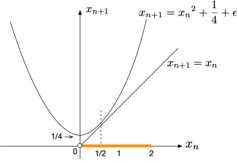 $c \gt 1/4$ で $x_n$は最終的に発散するが、十分に小さな $\epsilon \gt 0$を考えて、$c = 1/4 + \epsilon$と置くと、 値が「爆発」するまでに一定の猶予期間が生じることとなる。