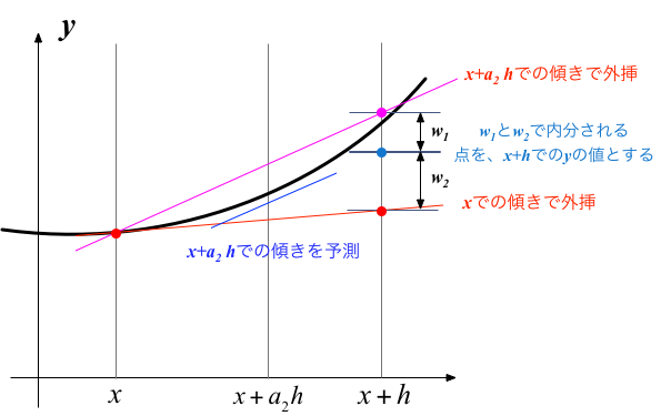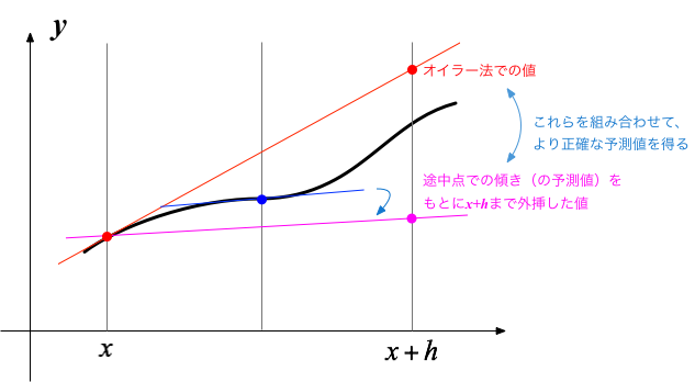 もう少し具体的には、下図のように、$x$と$x+h$の途中点での$y$の変化率(傾き)をまず予測し、その傾きを持つ直線を$x$から外挿し$x+h$での予測値を求める。 「現在」の$x$の傾きを外挿して得た予測値(オイラー法)とこれを組み合わせることで(例えば「平均」することで)、 図のように$y(x)$の変化が一様でない場合でも、予測の精度を上げられるのではないか?