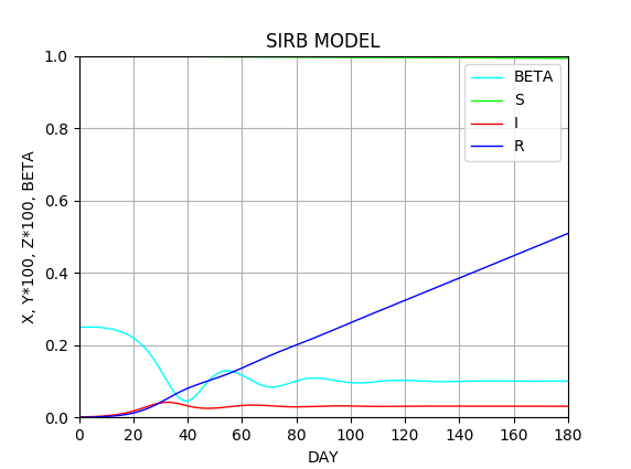 クラシックなSIRモデルをベースに考える。 全人口に占める罹患していない人(S)の割合を $x(t)$、感染者(I)の割合を $y(t)$、回復者(R)の割合を $z(t)$ と置くと、 基本的なモデルは $$ \begin{eqnarray} \frac{d x(t)}{d t} & = & - \beta(t) \, x(t) \, y(t) \tag{1} \\ \frac{d y(t)}{d t} & = & \beta(t) \, x(t) \, y(t) - \gamma y(t) \tag{2} \\ \frac{d z(t)}{d t} & = & \gamma y(t) \tag{3} \\ \end{eqnarray} $$ となる。 ここで、感染の状況に応じて人々の接触を抑制することで、$\beta$ が調整されていることを反映し、$\beta$ も時間に依存した変数と考えた。