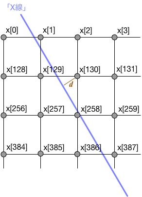 「X線」を表す直線が与えられれば、$k$番目の格子点とその直線までの距離を $d_k$ とすると、各格子点の減衰への寄与を