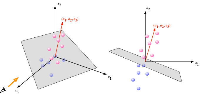 パーセプトロンは、$(a_1, a_2, \cdots, a_m)$を法線とするような超平面を境として、データ点を「あちら」と「こちら」に分類する(出力を0か1かに振り分ける)動作をする。下図の青丸を「あちら(出力0)」、赤丸を「こちら(出力1)」と見立て、動作の様子を考えてみるとよい。
