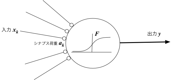 これは、ある種の神経の動作を単純化したモデルともなっている。$x_j$は$j$番目のシナプスに対する入力信号、$a_j$はその入力に対する敏感姓(シナプス荷重)、そして複数の入力信号の「荷重付き合算」によって出力$y$が決まる、という考え方である。