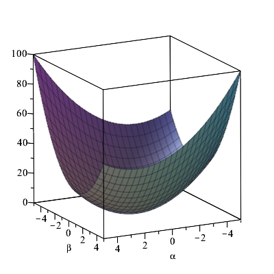 $F(\alpha,\beta)$ は、右図のような下に凸な形をしており、$\alpha,\beta=0$ で最小となる。
