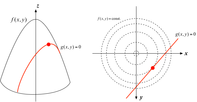 2変数の関数 $f(x,y)$ が与えられているとき、別の関数が $g(x,y)=0$ となる状況で、$f$を最大にするような$(x,y)$の組を求めたい。 このとき $g(x,y)=0$ を拘束条件と呼ぶ。