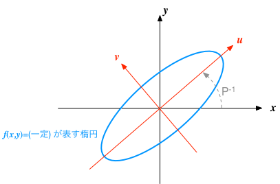 パラメータ $a,b,c$によって分布の形は変化するが、見通しをよくするために、行列 $$ A = \begin{pmatrix} a & b \\ b & c \\ \end{pmatrix} $$ を定義すると、 $$ f(x,y) = a x^2 + 2b x y + c y^2 = \begin{pmatrix} x & y \end{pmatrix} A \begin{pmatrix} x \\ y \end{pmatrix} $$ $A$が対角化できる、すなわち$A$の固有ベクトルから構成される直交行列$P$を使って、 $$ P^{-1}A P = \begin{pmatrix} \lambda_1 & 0 \\ 0 & \lambda_2 \\ \end{pmatrix} $$ と変換できることを使うと(ここで$P^{-1}=P^\top$)、座標変換 $$ \begin{pmatrix} u \\ v \end{pmatrix} = P^{-1} \begin{pmatrix} x \\ y \end{pmatrix} $$ によって、クロスする項の無い形 $$ \begin{pmatrix} x & y \end{pmatrix} A \begin{pmatrix} x \\ y \end{pmatrix} = \begin{pmatrix} u & v \end{pmatrix} P^{-1} A P \begin{pmatrix} u \\ v \end{pmatrix} = \lambda_1 u^2 + \lambda_2 v^2 $$ が得られる。