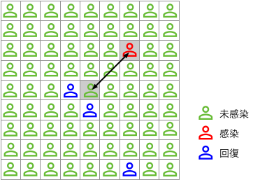 そして、初期に、ごく少数の感染者が分布してるような状況を想定し、 接触した相手が運悪く発病していた場合は、自分も感染してしまう。