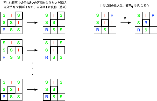 ここでの説明は疫病の伝搬を想定しているが、例えば、森林の火災の広がり(Sが燃えていない樹木、Iが燃焼中、Rが燃焼後)等のモデルと考えることもできる。