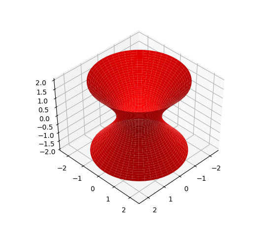 z軸に沿った「高さ」を$\xi$、「経度」を$\phi$とおいて、二次元の矩形領域と三次元座標との対応関係を $$ \begin{eqnarray} x(\xi,\phi) & = & \sqrt{C+\xi^2} \, \cos \phi \\ y(\xi,\phi) & = & \sqrt{C+\xi^2} \, \sin \phi \\ z(\xi,\phi) & = & \xi \end{eqnarray} $$ で与え、 双曲面を描画するコードの例を以下に示す: