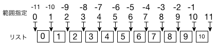 また、片側を省略したリスト名[n:]は、n番目から末尾まで、リスト名[:m]は最初からm-1番目まで、の意味になる。