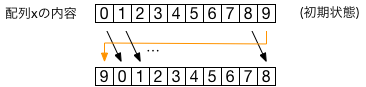 次の例題は、リスト中のデータを、ひとつ「右」(添字が大きい位置)にずらし、一番「右」のデータは、 一番「左」に移動(つまりデータの位置を右向きにシフト、あるいは回転)し、結果を表示するコードの例である。