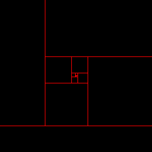 下図は、一辺の長さがフィボナッチ数列になるような大きさの正方形を並べて描いたものである。 漸化式 $x_n = x_{n-1} + x_{n-2}$ から、「2つ前までの正方形の辺の長さの和が、ちょうど次の正方形の辺の長さになる」ような関係が成り立っている。 原点(中央)から描画を開始し、図のようなパターンを描くプログラムを作成しなさい。