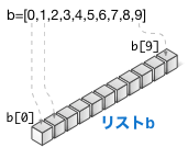 リストの要素の数は len(b)で得られる(lenはlength)。上の例ではbには要素が10個あるので len(b) は 10 となる。