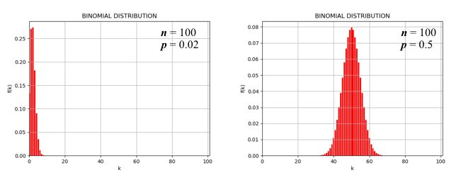 $n$が大きい場合、二項分布は2つの典型的な振る舞い方をする。 ひとつは、$p$が非常に小さい場合で、$k$が小さなところに「いびつに」偏る場合(下図左)、 他方は、$np$が$n$と比べてほどほどの大きさの場合で、平均値($np$)を中心として対称なベル型となる場合である(下図右)。 前者はポアソン分布と呼ばれる離散分布、後者は正規分布と呼ばれる連続分布でよく表現できることが知られている。
