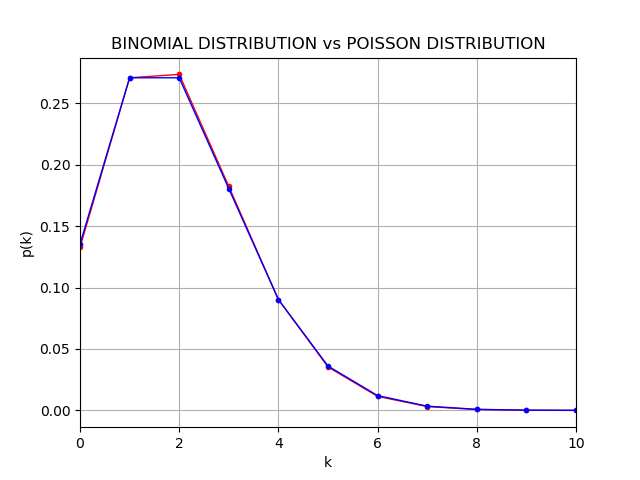 以下は、二項分布とポアソン分布をプロットして比較するPythonコードの例である: