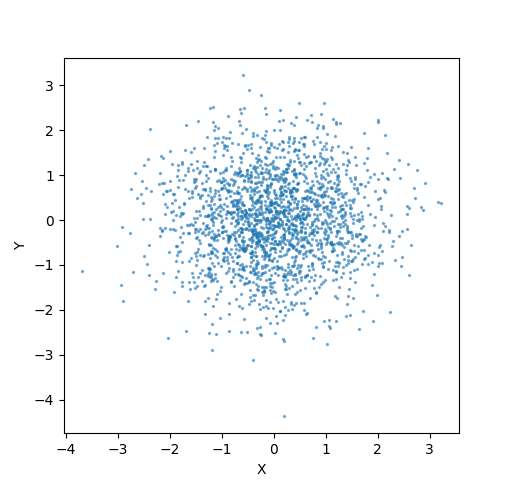 上のコードの実行例。原点を中心とした等方的な「雲」のように点が分布している様子がわかる。 $X$と$Y$はそれぞれが独立なガウス分布に従っている。