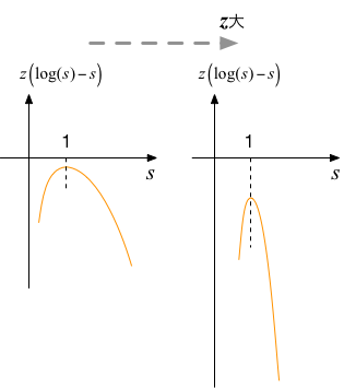 $z$の値が大きくなると、指数関数の肩の$z (\log(s)-s)$は幅が狭まり鋭い頂点を持つようになるので、 頂点の辺りだけを放物線で表したとしても、よい近似が得られる。