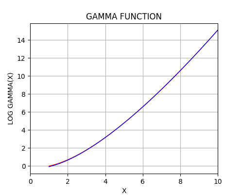 Pythonでは、ガンマ関数は数学ライブラリとして用意されており、積分を行わずとも、import math しておけば、math.gamma( )で呼び出すことができる。以下に、ガンマ関数の値とスターリングの近似値のそれぞれ対数を計算し、比較してプロットするコードの例を示す。