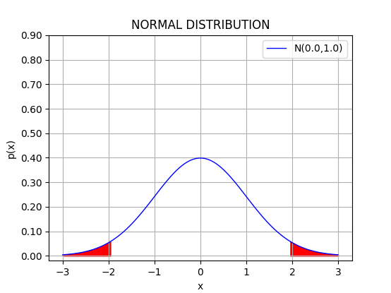 赤で示したのは、分布の片側の確率が0.025 (両側で0.05)となる領域で、 凡そ標準偏差の $\pm 1.96$倍以上の範囲に相当。 それ以外のベル型の中央部分が95%の信頼区間に対応。