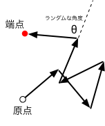 2次元でランダムに回転する長さ1の棒の鎖について、その様子をシミュレーションするPythonコードの例を以下に示す。 このコードでは棒を100個繋げて(薄紫で表示)、一方の端は原点(画面中央)に固定の上、他方の端を赤い点で示すようにしている。