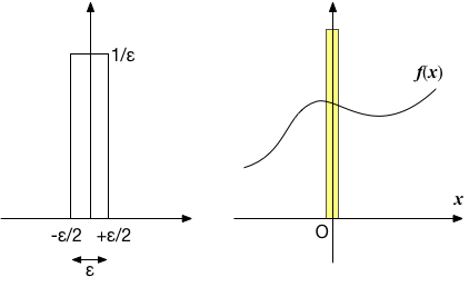 下図のような、0を中心に幅が$\epsilon$、高さが$1/\epsilon$の矩形の形状をした分布を考えてみよう。 $\epsilon$の大小にかかわらず、矩形の面積は1である。 この分布関数を$\delta(x ; \epsilon)$と表記することにする。 そして、別の関数との積を取って積分すると、$f$の不定積分を$F$とすると、 $$ \int \delta(x; \epsilon) f(x) dx = \int_{-\epsilon/2}^{+\epsilon/2} \frac{1}{\epsilon} f(x) dx = \frac{F(\epsilon/2) - F(-\epsilon/2)}{\epsilon} $$ と書くことができる。