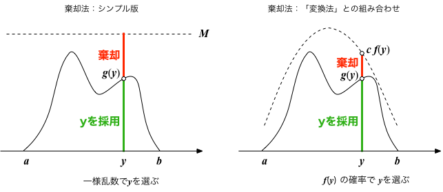 目的とする分布関数の積分とその逆関数を見つけるのは、一般には、容易でない。そのような場合は、 少し効率は劣るものの、棄却法(rejection method)を用いることができる。