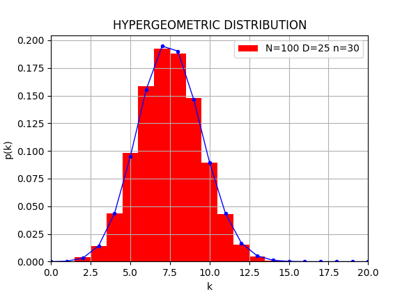赤いバーがシミュレーション結果、青線が対応する超幾何分布。