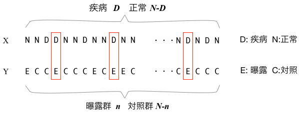 $N$個の要素から成るXとYの2つのリストがあって、Xには「疾患有り」を表すDが$D$個、「無し」を表すNが$N-D$個、 他方Yは、暴露群に割当られたことを示すEが$n$、対照群を表すCが$N-n$、それぞれ割当られているような状況を考える。 XとYの要素をランダムに組み合わせたときに、XとYがD-Eになっているような組(図の赤枠)の数が、上記の説明の$k$の値に対応するはずだ。