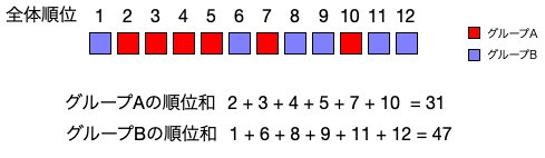例えば、グループAが6人、グループ2も6人の、全体で12名の場合を考えると、グループAの順位和の現れ方として