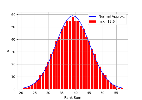 グループのメンバーの数が大きければ、この分布は平均が $$ \mu = \frac{n_A (n_A + n_B+1)}{2} $$ 分散が $$ \sigma^2 = \frac{n_A n_B (n_A + n_B + 1)}{12} $$ の正規分布で近似できることが知られている(グラフ中、青色の実線でプロット)。