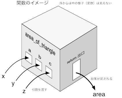 上で述べた例で、関数area_of_triangle( )が働く様子を、呼び出し側から眺めてみたとすると、(講義担当者の頭の中には)下の様な情景が浮かんでくる。
